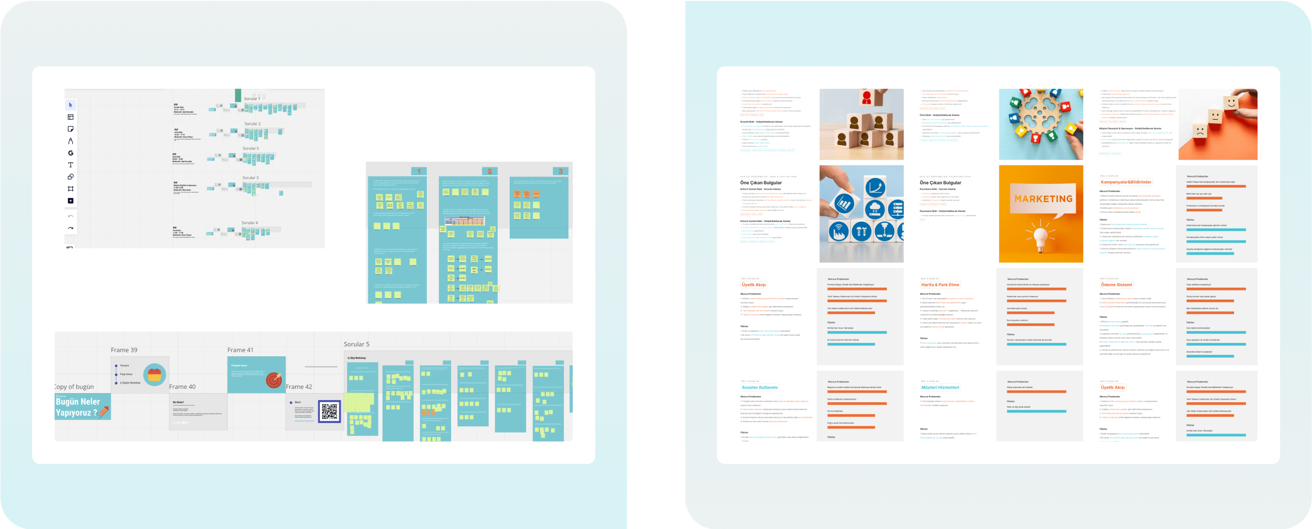 Before moving on to detailed UX research, we held separate kick-off workshops with five teams. In these workshops, each team had different user experience ideas and problems that they focused on. We divided the main ideas and issues into tags and analyzed them in detail. These analyses clarified criteria such as the idea's feasibility, technical constraints, and schedule.