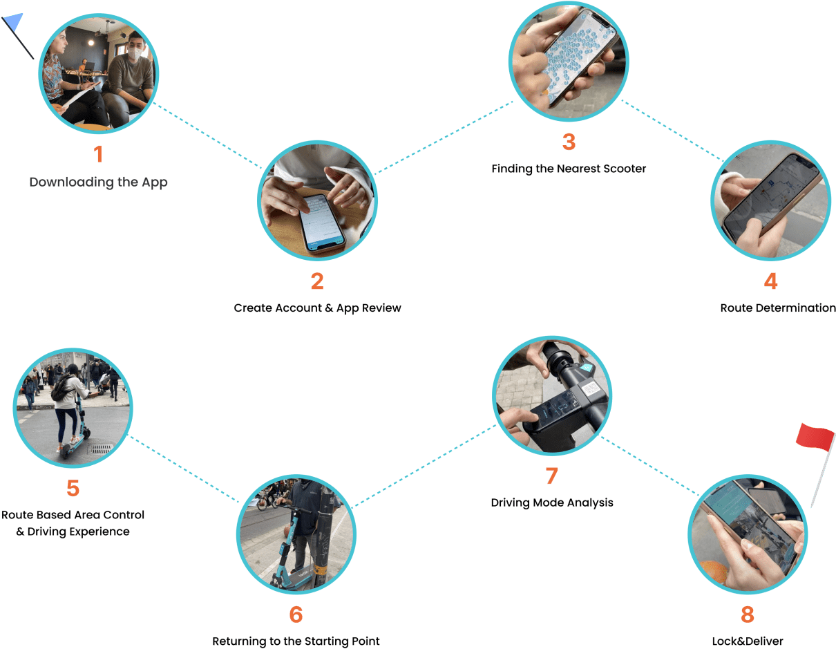 We started the BinBin Scooter app project with research. Our research included fieldwork with users, netnography, and benchmarking. Customer goals and, as a result of the research findings, we clarified the design decisions.